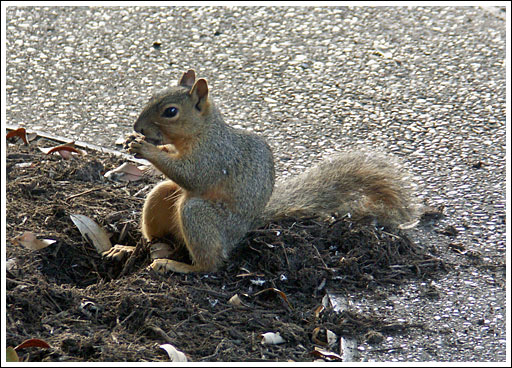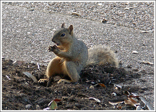'Made me laugh. The squirrel was just sitting back munching away at that nut. Or maybe it was an acorn. It looked like he'd dug up his prize and then settled in comfortably on top of the stuff he'd dug up. I moved a bit to the right (trying to get a better shot of the way he was sitting):