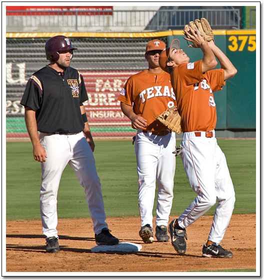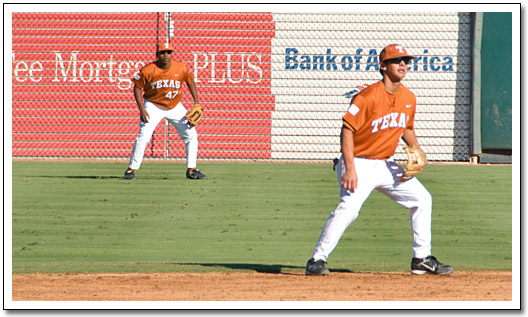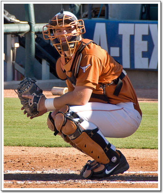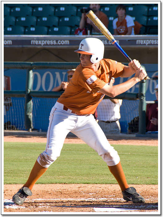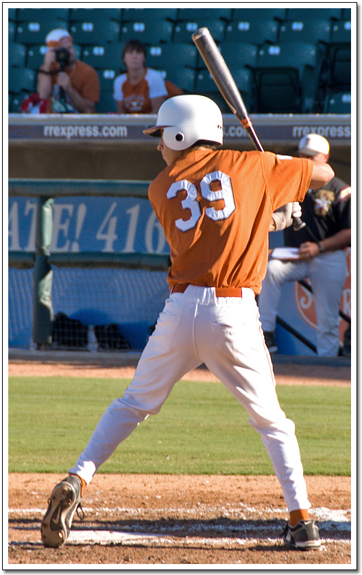 I took quite a few photos at the Texas State exhibition game on October 27th. Sadly, the Horns lost the game. Texas State scored solo runs in the 3rd and 4th. Texas scored solo runs in the 6th and 7th to tie things up. However, they gave up 2 more in the 8th. Kevin Keyes hit his 2nd home run in as many fall exhibition games in the 9th to bring the Horns back within one run. Alas, the game ended shortly thereafter. Texas lost 3-4.