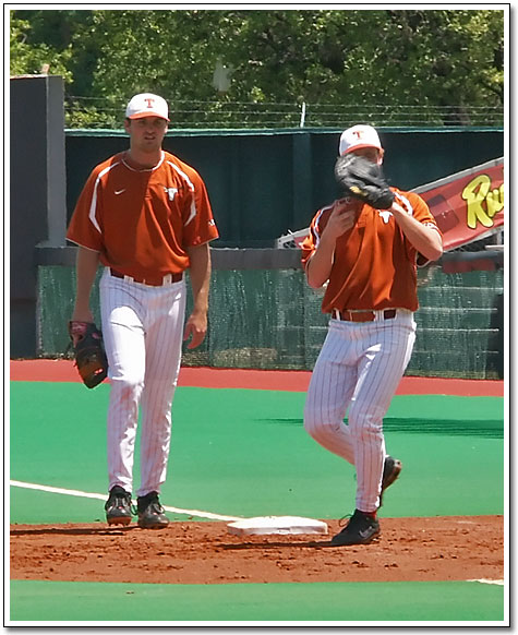 Infield drills are just about over (that's Preston Clark and Tommy Harmon in the foreground):