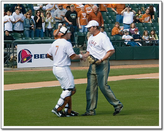 Preston Clark and Roger Clemens shake hands after Roger threw out the first pitch: