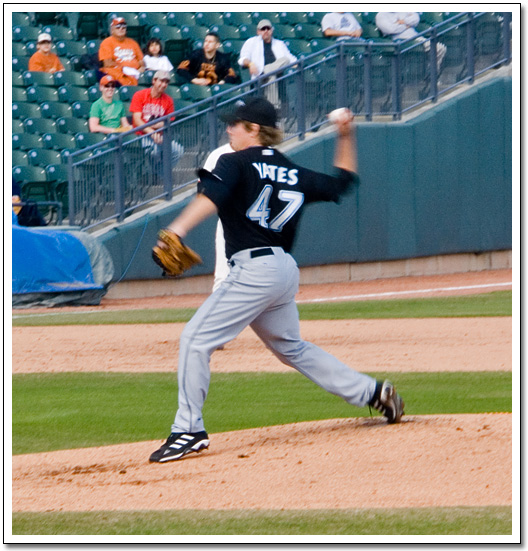 Sadly, this is the only photo I got of Kyle as he was pitching. The only thing in focus is his left foot. The rest of him was moving too fast for my camera settings. Sigh...