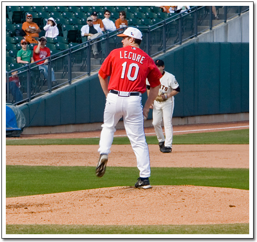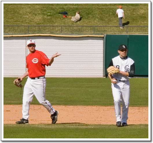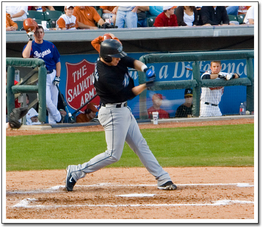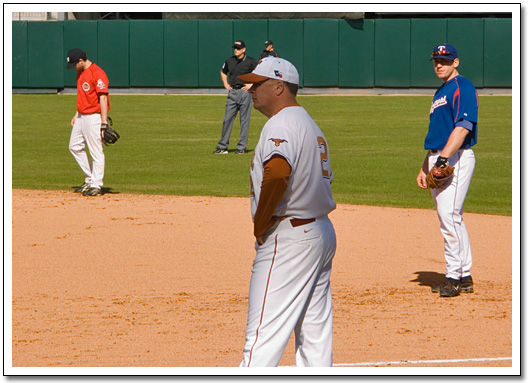 That's J.D. Reininger at 2b, Taylor Teagarden at 1b, and Greg Swindell in the first base coach's box. I like how Greg's in a little tiny spot of shade. It almost looks like I did a rather poor job of "Photoshopping" him into the photo, eh? Heh.
