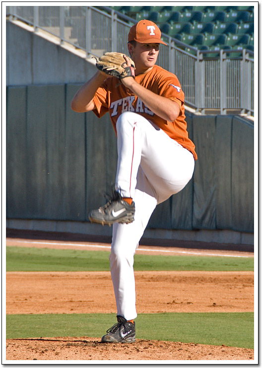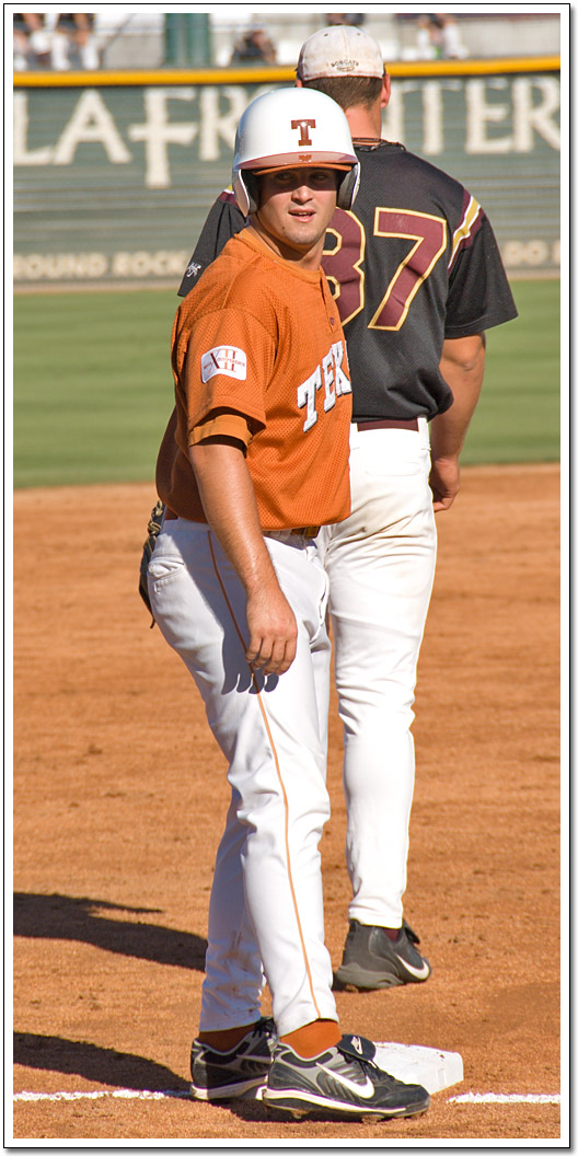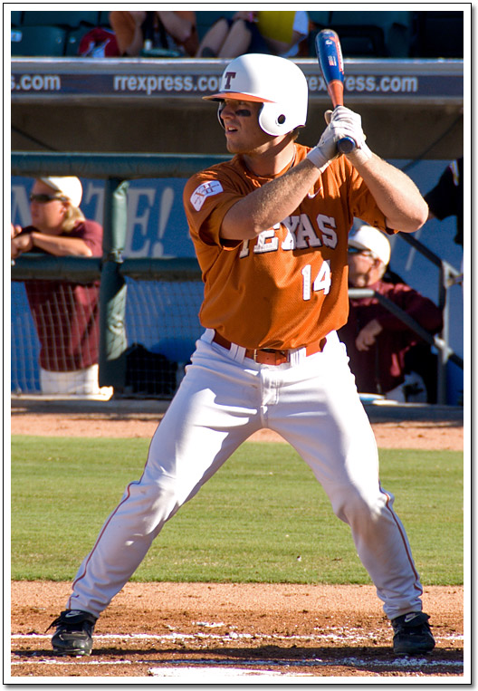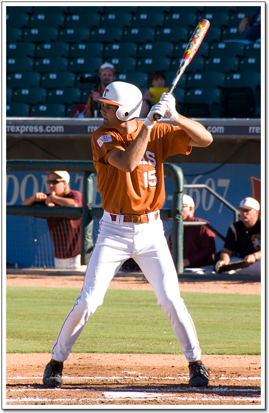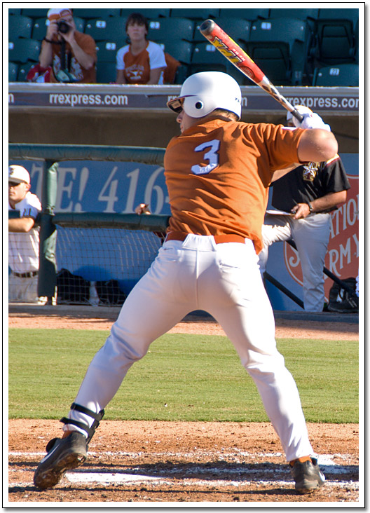 I took quite a few photos at the Texas State exhibition game on October 27th. Sadly, the Horns lost the game. Texas State scored solo runs in the 3rd and 4th. Texas scored solo runs in the 6th and 7th to tie things up. However, they gave up 2 more in the 8th. Kevin Keyes hit his 2nd home run in as many fall exhibition games in the 9th to bring the Horns back within one run. Alas, the game ended shortly thereafter. Texas lost 3-4.