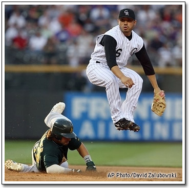 Isn't it great? It was taken on June 20th in the Rockies/A's game. Omar was jumping over Nick Swisher on the front end of a double play. I wonder if Brad Halsey or Huston Street went in for the A's during the game? I could look it up but what fun would that be? At any rate, there were three Longhorns on the same Major League field that day. Cool.